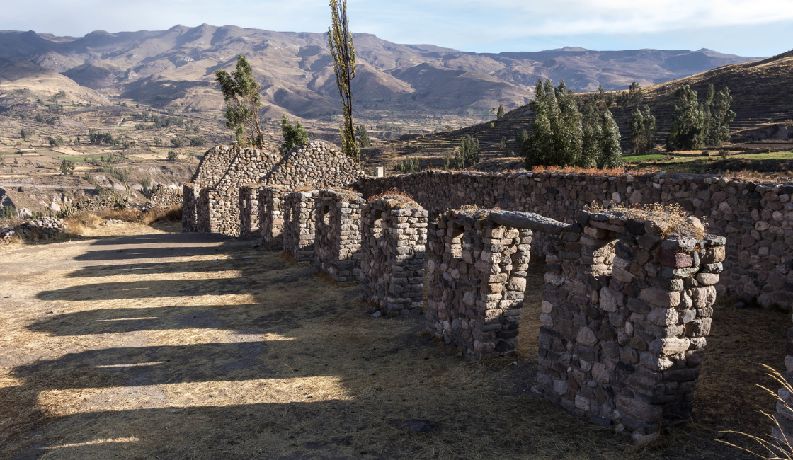 Ciudadela preinca Collagua con andenes y recintos de piedra, ubicada en el Valle del Colca.